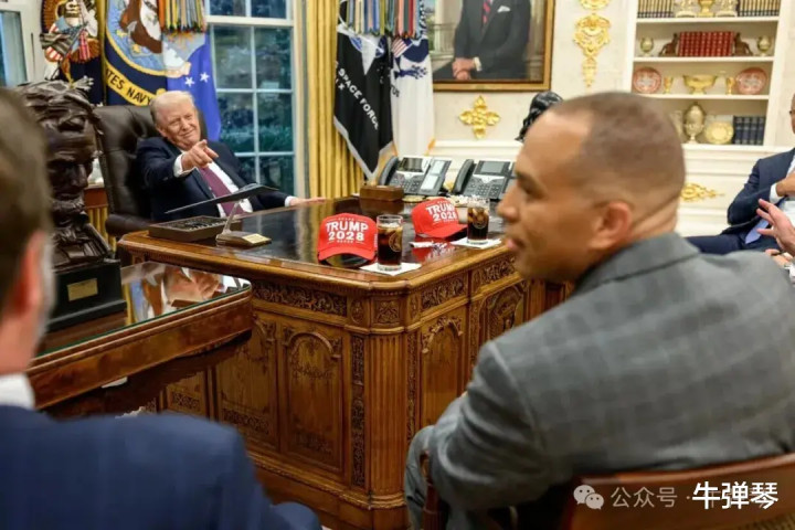 但图片显示,特朗普办公桌上,摆着两顶红帽子,“特朗普2028”,直接冲着民主党领袖。
